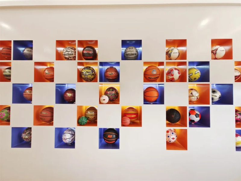 মেইডং স্পোর্টসের পণ্য শোরুমে, বিভিন্ন স্টাইল এবং উজ্জ্বল রঙের কয়েক ডজন বাস্কেটবল, ফুটবল এবং ভলিবল পণ্য রয়েছে।