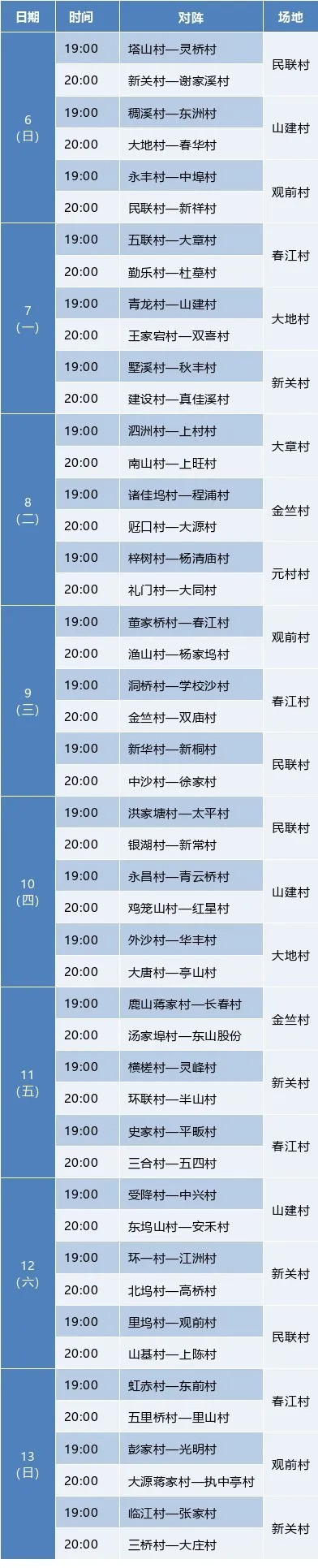 প্রতিযোগিতাটি নয়টি প্রতিযোগিতা জোনে অনুষ্ঠিত হয়েছিল: ডংজু সাবডিস্ট্রিক্টের মিনলিয়ান গ্রাম; দাদি ভিলেজ, জিনঝু ভিলেজ এবং ইয়িনহু সাবডিস্ট্রিক্টে গুয়ানকিয়ান ভিলেজ (ঝাউগংওয়ু); চুনজিয়াং ভিলেজ এবং চুনজিয়াং সাবডিস্ট্রিক্টের শানজিয়ান ভিলেজ; জিন্ডেং শহরে ইউয়ান গ্রাম; চ্যাংএলভি টাউন বাস্কেটবল বাস্কেটবল হল; এবং দয়ুয়ান শহরে জিঙ্গুয়ান গ্রাম । এই বছর, আরও বেশি লোক তাদের দোরগোড়ায় ঠিক উত্তেজনাপূর্ণ গেমগুলি দেখতে সক্ষম হবে।